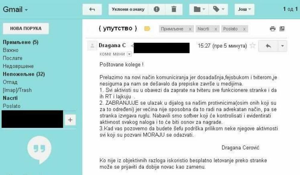 Tako je jedna od aktivistkinja Dragana Cerović slala mejl pristalicama da ne smeju da kače fotografije sa letovanja koja dobijaju preko stranke.
