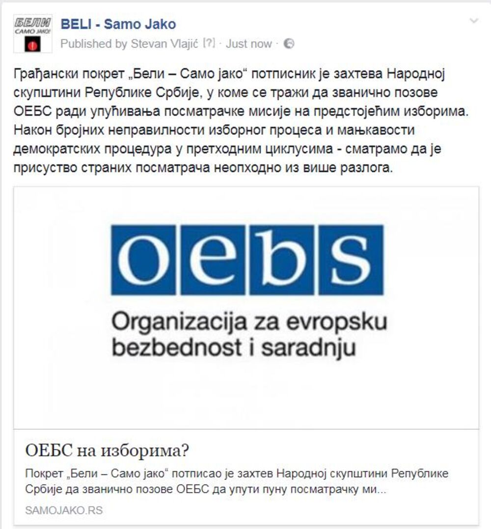 Pokret „Beli – Samo jako“ potpisao je zahtev Narodnoj skupštini Republike Srbije da zvanično pozove OEBS da uputi punu posmatračku misiju za sprovođenje i održavanje predstojećih izbora.