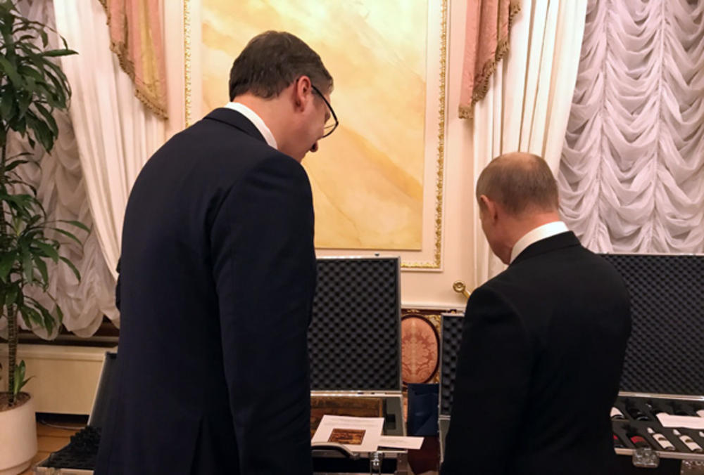 Predsednik Srbije Aleksandar Vučić i predsednik Ruske Federacije Vladimir Putin razmenili su poklone prilikom sastanka koji su imali u Kremlju.
