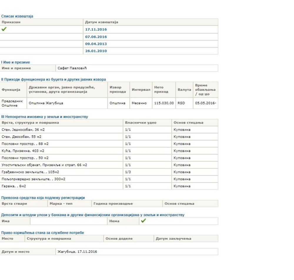 Pavlović je Agenciji za borbu protiv korupcije prijavio dva stana, dva poslovna prostora, kuću, ugostiteljski objekat, građevinsko zemljište, poljoprivredno zemljište, garažu i platu od 115.000 dinara.