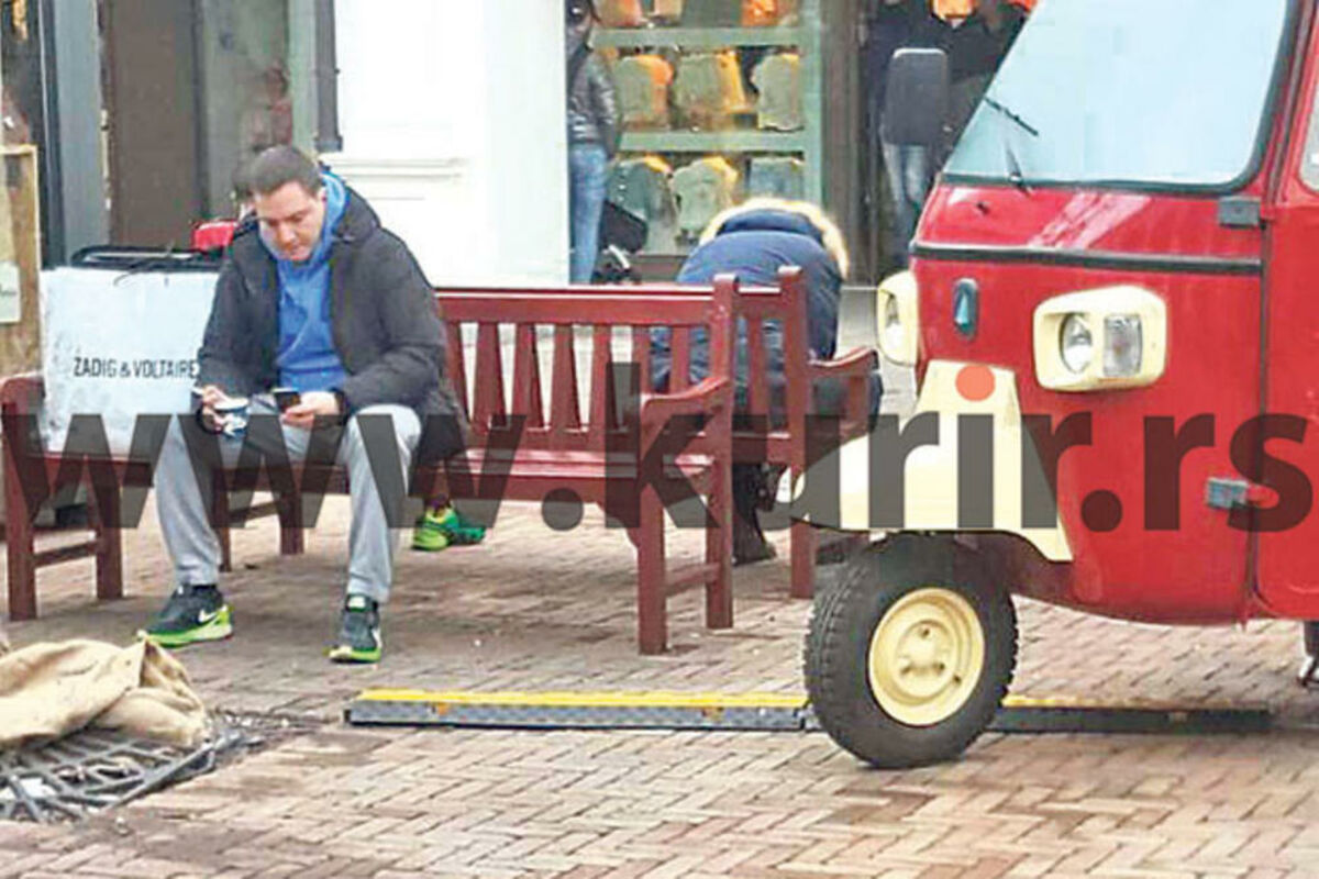 U trenerci i patikama, Ružić je nakon napornog šopinga seo na klupu, zapalio cigaretu i uz šoljicu kafe ubio vreme čitajući poruke na telefonu.