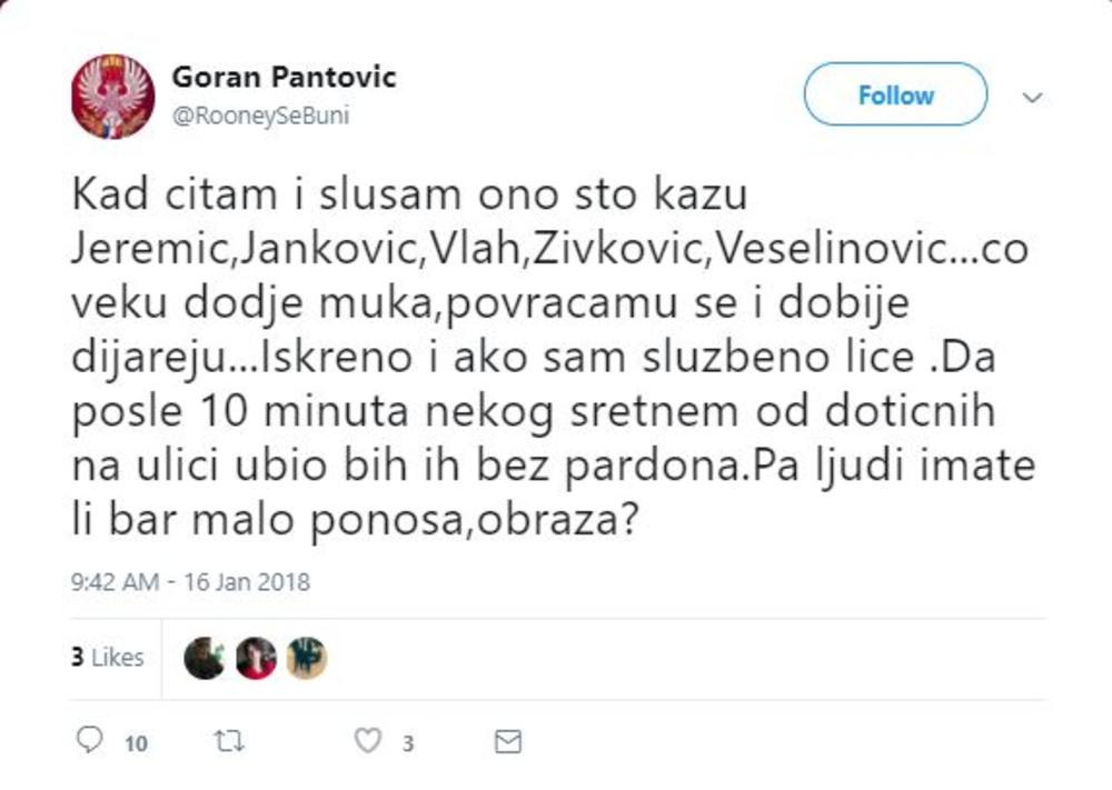 - Kad čitam i slušam ono što kažu Jeremić, Janković, Vlah, Živković, Veselinović...čoveku dođe muka, povraća mu se i dobije dijareju...Iskreno i ako sam službeno lice. Da posle 10 minuta nekog sretnem od dotičnih na ulici ubio bih ih bez pardovana. Pa ljudi imate li bar malo ponosa, obraza - napisao je izvesni Goran Pantović na Tviteru.