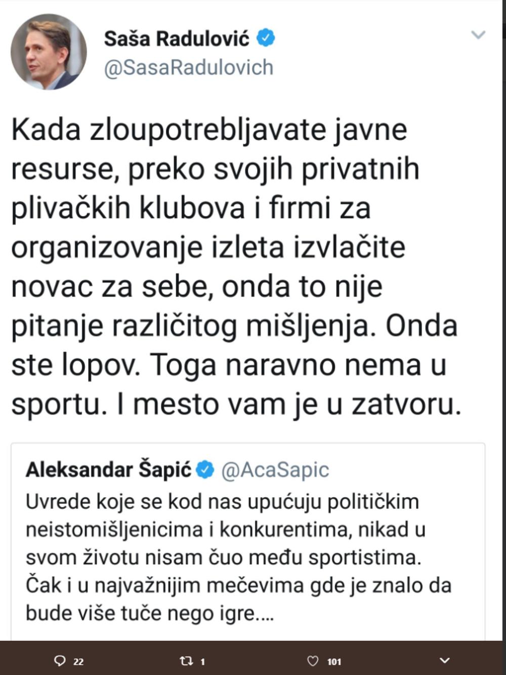 ''Kada zloupotrebljavate javne resurse, preko svojih privatnih plivačkih klubova i firmi za organizovanje izleta izvlačite novac za sebe, onda to nije pitanje različitog mišljenja. Onda ste lopov. Toga naravno nema u sportu. I mesto vam je u zatvoru'', napisao je Radulović.