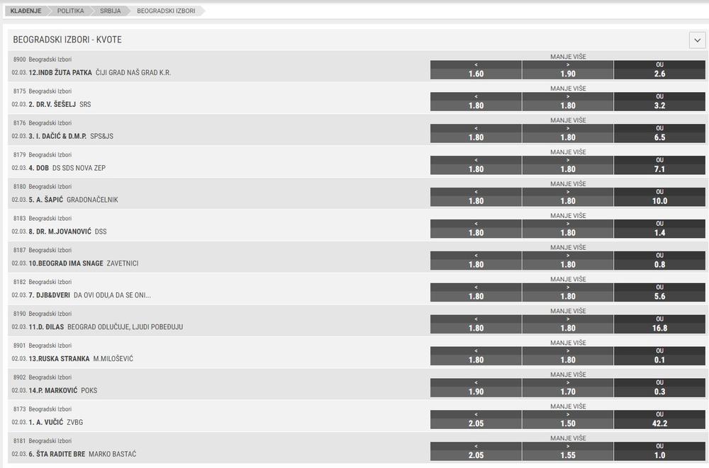 Najpre, pogledajte kakve je kvote dala jedna od naših kladionica. Desno je procenat koji će partila ili lista osvojiti, a levo kvote na manji ili veći rezultat od toga: