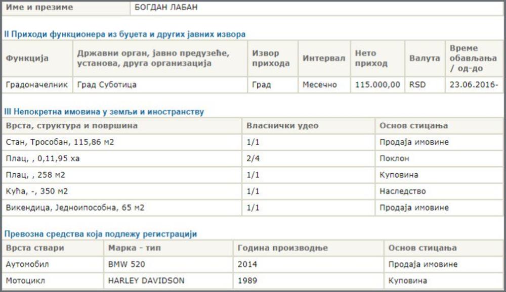 Inače, Laban prema podacima Agencije za borbu protiv korupcije ima samo platu gradonačelnika koja iznosi 115.000 dinara.