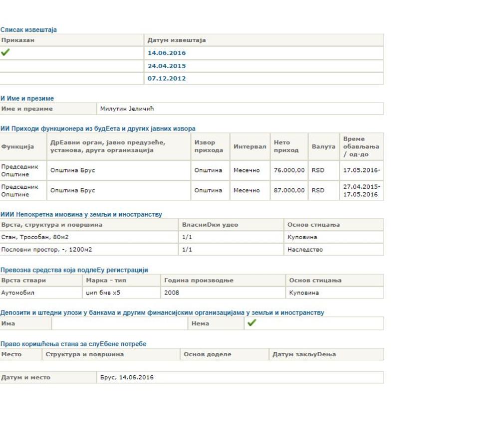 Kada je 2015. godine Agenciji prijavljivao promene, već je bio predsednik opštine Brus, i tada mu je plata bila 87.000 dinara. Tada je prijavio stan od 80 kvadrata koji je kupio, i poslovni prostor od 1.200 metara kvadratnih, koji je nasledstvo. Automobil je zamenio novijim, jer ovaj BMW X5 koji je prijavio 2015. je iz 2008. godine.