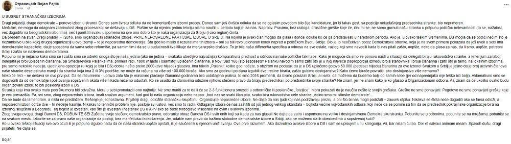 Da pređem na stvar. Dragi prijatelji - i 2016. smo organizovali stranačke izbore. PRVE NEPOSREDNE PARTIJSKE IZBORE U SRBIJI. Na kojima je svaki član mogao da glasa i donosi odluke ko će ga predstavljati u narednom periodu. Ako je, u ovako teškim vremenima, DS mogla da se podiči nečim što je nezamislivo u bilo kojoj drugoj organizaciji u ovoj zemlji – to je neposredna demokratija. Šta god ko mislio o rezultatima tih izbora – oni su bili revolucionaran korak napred u političkom životu Srbije. Bio je to neočekivan potez Demokratske stranke, koja je na svom primeru pokazala da još uvek u sebi ima demokratske kapacitete, da je sposobna da sama sebe reformiše, pa samim tim i da se u budućnosti kvalifikuje da menja srpsko društvo. To je bila naša differentia specifica u odnosu na sve ostale, razlog koji smo navodili kada bi nas pitali zašto, uopšte, neko da glasa za nas, da li smo, uopšte, potrebni Srbiji i zašto se nazivamo demokratama - napisao je Pajtić na svom Fejsbuk profilu.