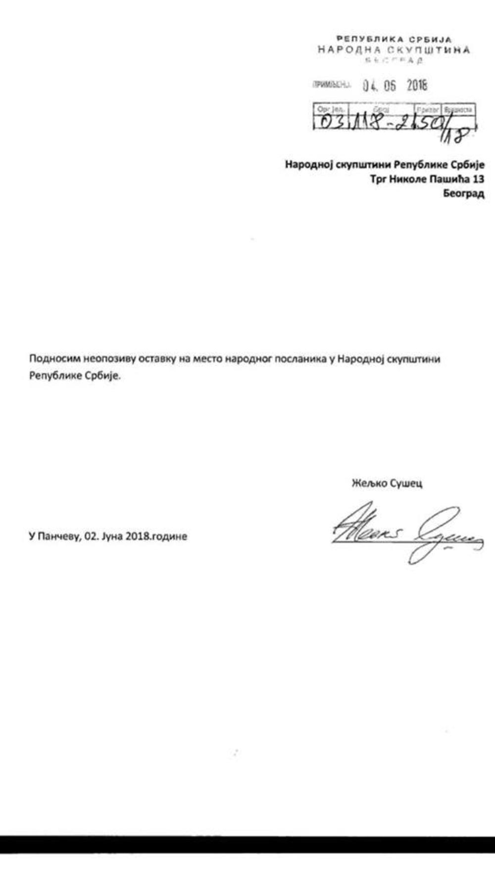Poslanica Marinika Tepić, objavila je na Tviteru da je poslanik Željko Sušec iz Pančeva uputio Skupštini ostavku na poslaničku funkciju, nakon što je ona objavila dokaze o koruptivnim radnjama njegove majke, za šta je on posredovao.