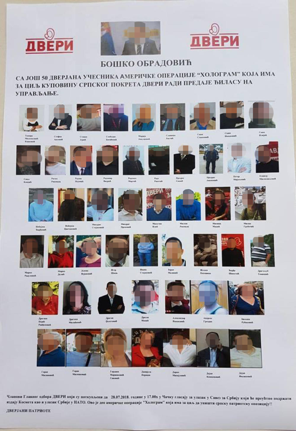 Ovi plakati osvanuli su u ispred štabova Dveri u u Kostolcu, Aranđelovcu, Mladenovcu, Beogradu, Pančevu, Lazarevcu. Na tim plakatima piše da će navodno članovi Glavnog odbora Dveri koji su potkupljeni da 28. jula u Čačku glasaju za ulazak u Savez za Srbiju i da će prećutno podržati izdaju Kosova, kao i ulazak Srbije u NATO, i da je sve ovo deo te američke operacije "Hologram" koja ima za cilj da uništi srpsku patriotsku opoziciju.