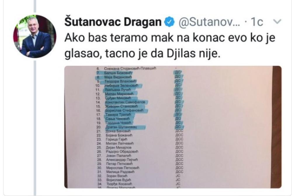 Međutim, tadašnji lider DS, Dragan Šutanovac, demantovao je bivšeg zaštitnika građana. On je dostavio spisak poslanika koji su glasali za, 14 njih iz DS, među kojima i sam Šutanovac.