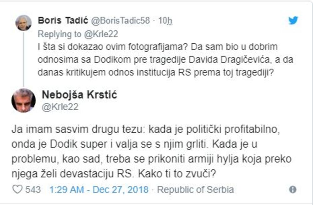 - Bedno spinuješ. Nisam govorio o sadržaju tog naslova, već o tvom retvitovanju mojih slika sa Dodikom i odnosu tvog sadašnjeg gazde sa njim. Ali, o tome nemaš šta da kažeš, pa skrećeš temu na nešto što nijednog trenutka nije ni bila tema - napisao mu je Tadić.