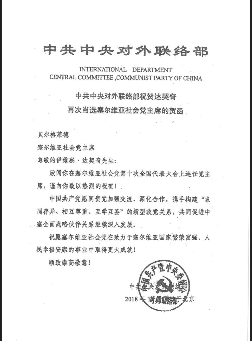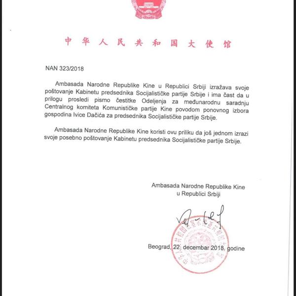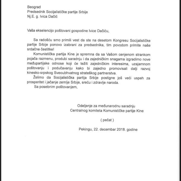 Kako u čestitki koja je stigla na kineskom jeziku, uz prevod piše, Komunistička partija Kine je sa radošću primila vest da je Ivica Dačić predsednik SPS ponovo izabran za predsednika Partije.