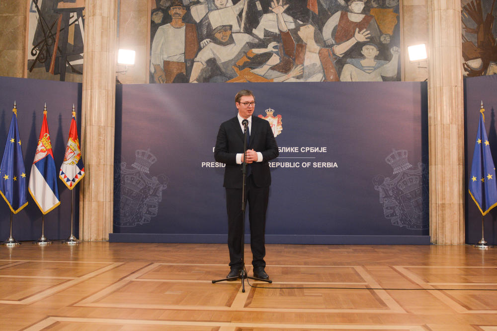 Predsednik Republike Srbije Aleksandar Vučić uručio novogodišnje paketiće deci iz tri osnovne škole sa Kosova i Metohije, nakon čega je dao izjavu za medije.