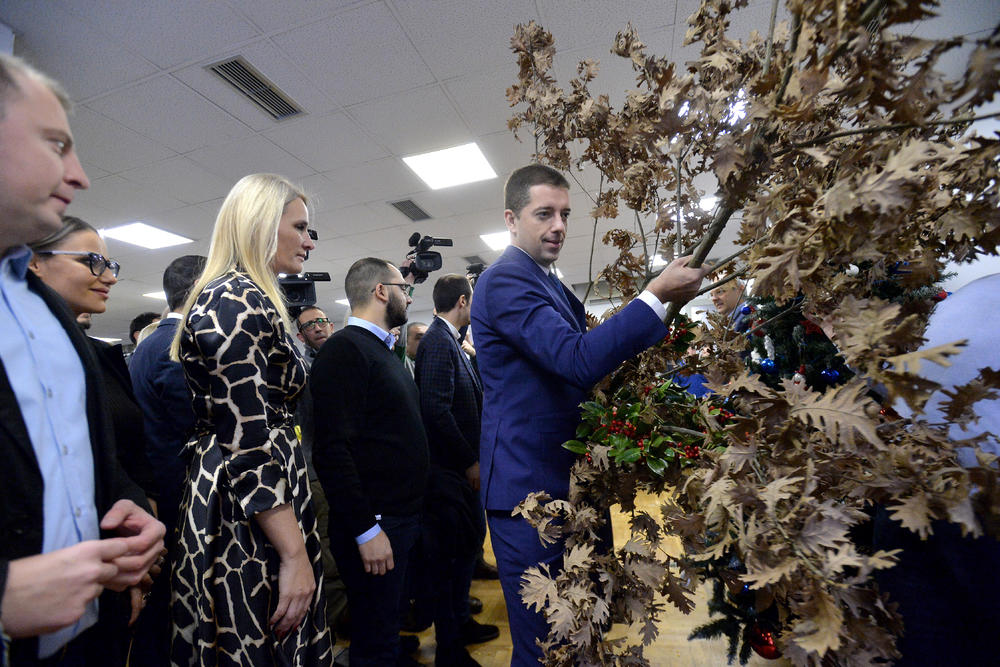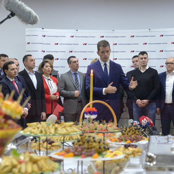 Funkcioner SNS Marko Djurić je prethodno uneo badnjak u prostorije SNS i obratio se okupljenim gostima rekavši da predstoji godina u kojoj će se boriti na način kao što je to do sada činio Vučić.
