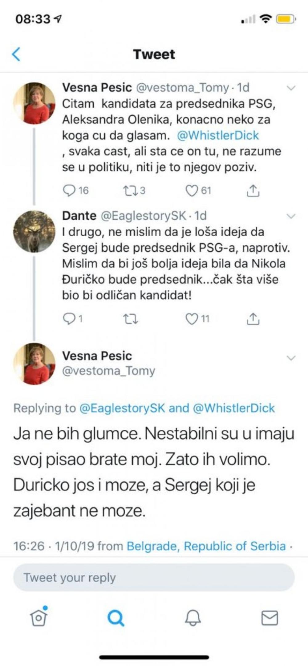 Sociološklinja Vesna Pešić prokomentarisala je njegovu potencijalnu kandidaturu za predsednika PSG porukom: "Šta će on tu, kad se ne razume u politiku".