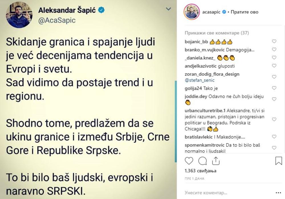 - Skidanje granica i spajanje ljudi je već decenijama tendencija u Evropi i svetu. Sad vidimo da postaje trend i u regionu. Shodno tome, predlažem da se ukinu granice i između Srbije, Crne Gore i Republike Srpske. To bi bilo baš ljudski, evropski i naravno srpski - napisao je Šapić.