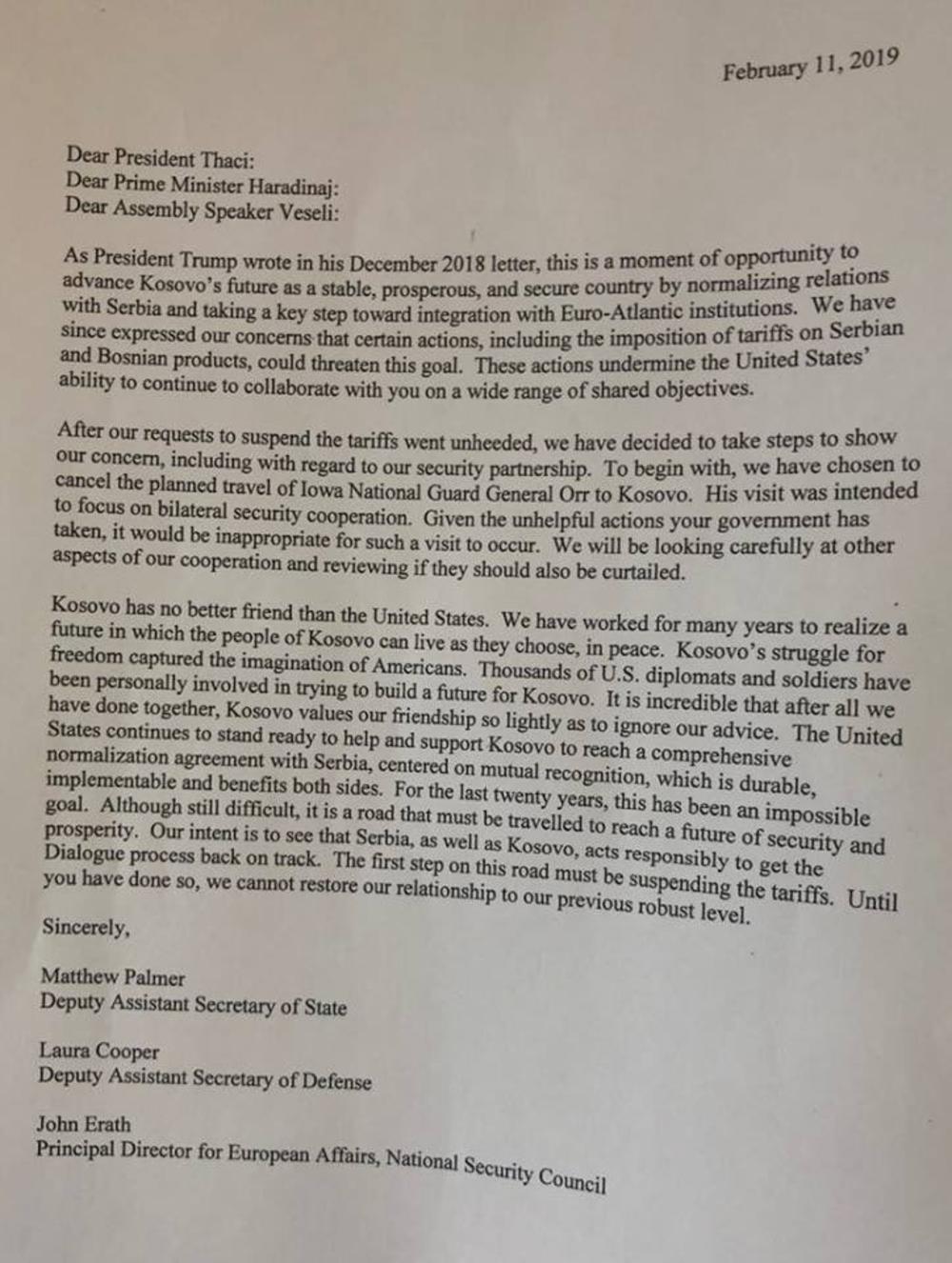 Pismo bez presedana kosovskim liderima koje su potpisali DoD, Državni zavod, NSA