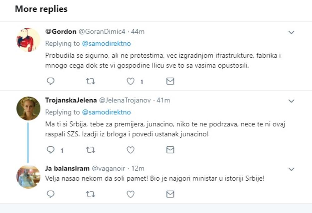 Ilić je na društvenoj mreži Tviter pisao, obraćajući se upravo Ani Brnabić, rečima da narod nije zviždao Srbiji, već vlasti.