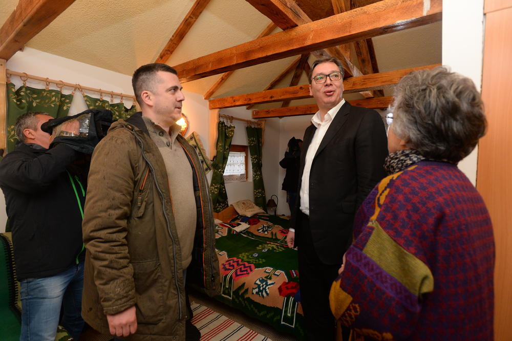 Predsednik je obišao jednu od brvnara, nakon čega je u sali za ručavanje, koja se nalazi u sklopu etno sela, sa meštanima razgovarao o ulaganjima u etno turizam.
