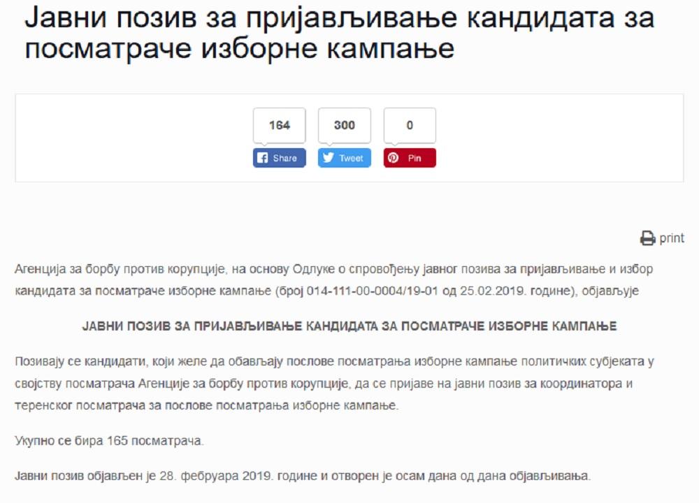 "Iiiii... prvi zvanični vesnik izbora?! Agencija za borbu protiv korupcije objavila javni poziv za 165 posmatrača izborne kampanje za 27 gradova sa okruzima i Grad Beograd!"