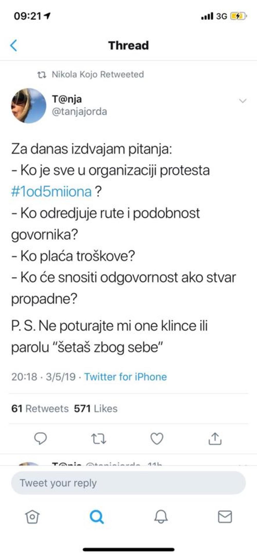Tanja Jordović, dugogodišnja novinarka, zapitala se na Tviteru ko je sve član organizacije "1 od 5 miliona" izazvaši veliku polemiku na ovoj društvenoj mreži.