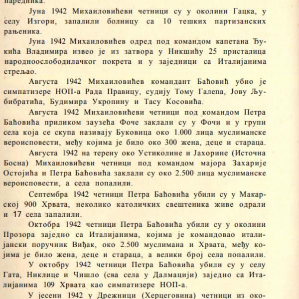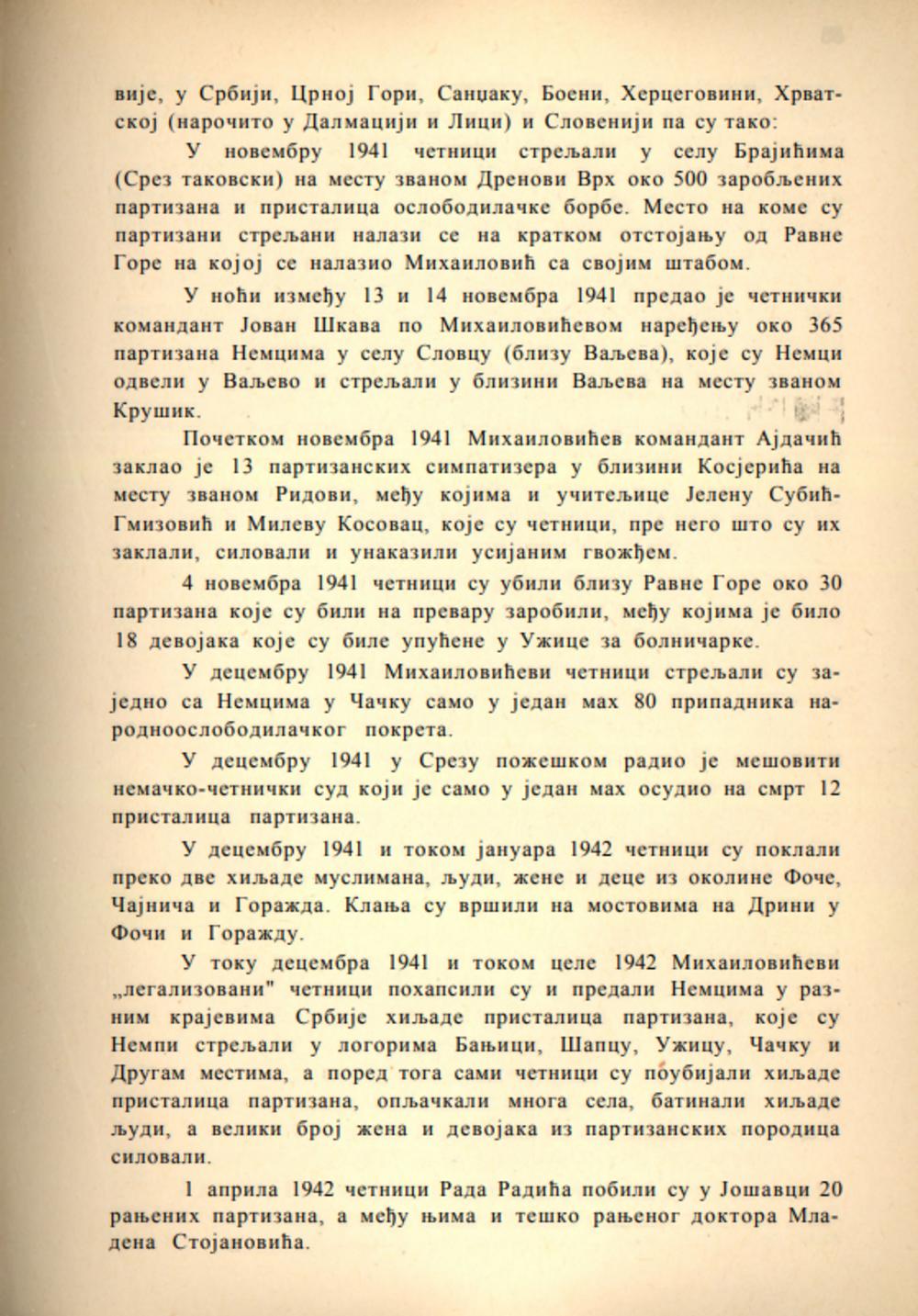 *U toku decembra 1941. i tokom cele 1942. Mihailovićevi četnici pohapsili su i predali Nemcima u raznim krajevima Srbije hiljade pristalica partizana, koje su Nemci streljali u logorima Banjici, Šapcu, Nišu, Užicu, Čačku i drugim mestima, a pored toga sami četnici su poubijali hiljade pristalica partizana, opljačkali mnoga sela, batinali hiljade ljudi, a veliki broj žena i devojaka iz partizanskih porodica silovali.