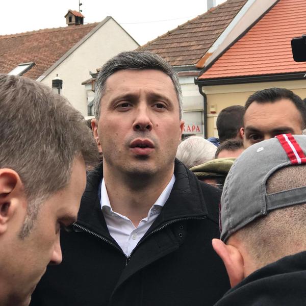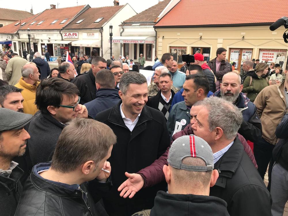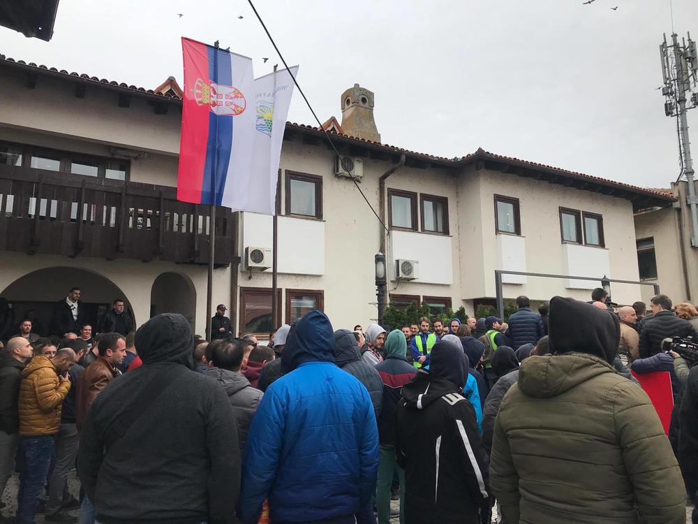Okupljeni su podeljeni u dva tabora. Jedni podržavaju ostavku Simonovića, dok mu drugi, pristalice SNS, pružaju podršku. Iako je situacija sve vreme bila napeta, nije bilo pripadnika policije.