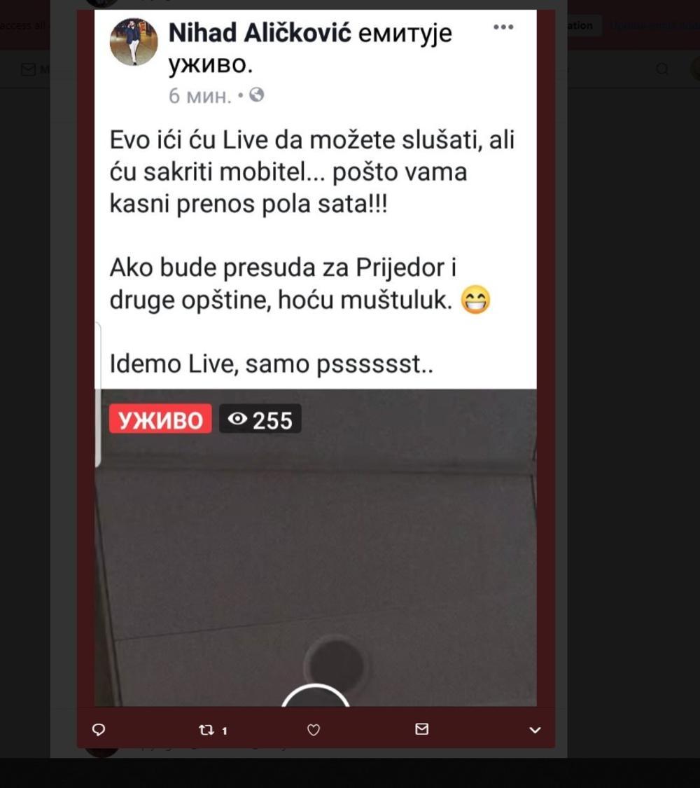 Nihad Aličković, glavni aktivista organizacije "Anti Dejton", poznate po tome da su organizovali napade na predsednika Srbije Aleksandra Vučića u Potočarima, juče je prekršio pravila Haškog tribunala i emitovao na svom Fejsbuk profilu uživo izricanje pravosnažne presude Radovanu Karadžiću, dok je prema odluci suda ceo svet gledao ovaj prenos 30 minuta odloženo.