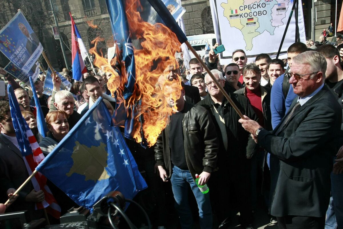 Lider Srpske radikalne stranke Vojislav Šešelj zapalio je danas u centru Beograda zastave EU i NATO.