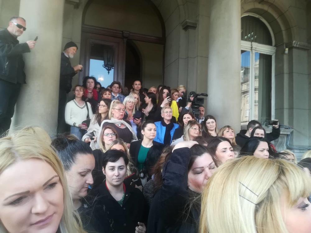 Žene iz Saveta za rodnu ravnopravnost grada Beograda tokom protesta pripadnika Saveza za Srbiju sele su ispred Starog dvora.