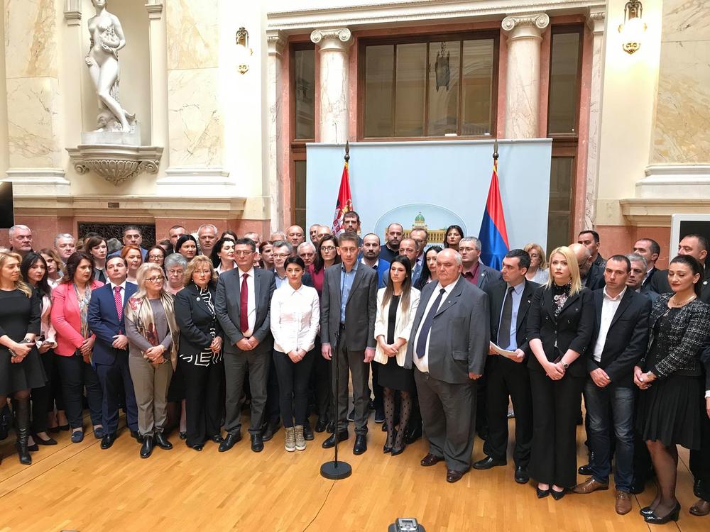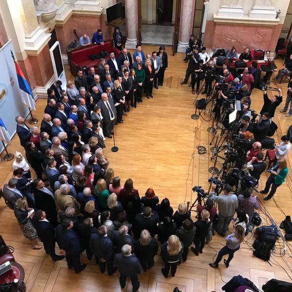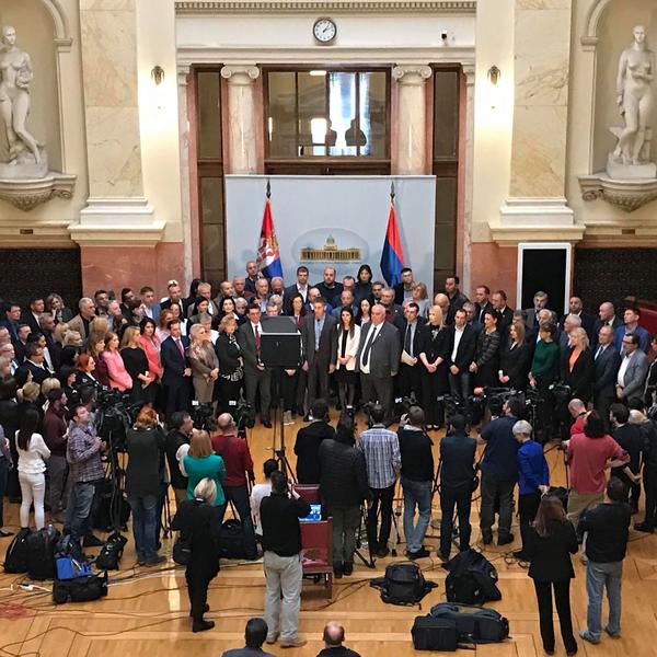 On je još rekao da poslanici koji su trenutno prisutni u Skupštini, a to su poslanici vladajuće koalicije - SNS, SPS, SDPS, NS-UŠ, Pokreta socijalista, da su oni spremni da od danas, pa do kad bude potrebno brane parlament.