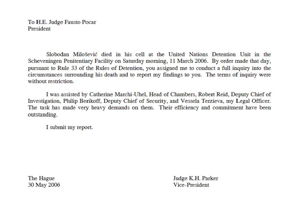 Uznemiren zbog glasina koje su počele da kolaju u medijima da je Milošević otrovan, predsednik Tribunala Fausto Pokar naredio je opsežnu istragu koju je poverio sudiji Kevinu Parkeru.
