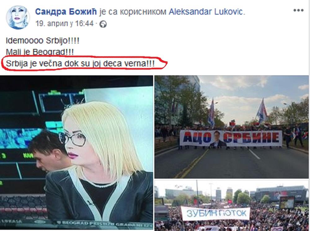 Narodna Poslanica SNS-a Sandra Božić, oglasila se na svom fejsbuk nalogu komentarišući prošlonedeljni skup u okviru kampanje "Budućnost Srbije" sa rečenicom "Srbija je večna dok su joj deca verna."