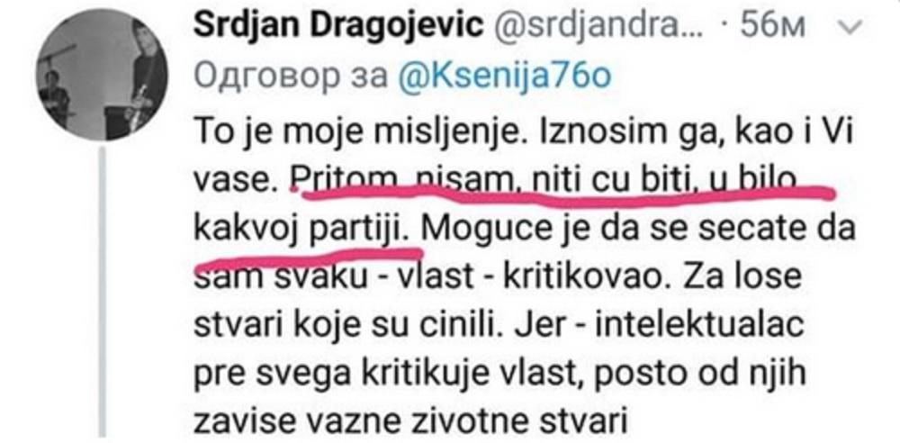 Ovaj tvit pokrenuo je lavinu komentara, a mnogi su kao dokaz stranačke obojenosti kačili Srđanov intervju za Blic iz 2010. godine s naslovom: "Dragojević: SPS logičan izbor!"