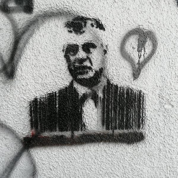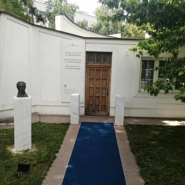 Slika Irahima Rugove je tu, na zgradi kod glavnog šetališta kojim idemo do spomenika Skenderbega. I ako je na njemu dvoglavi orao, onaj crni - albansi i mapa Albanije i dalje ga Srbi prisvajaju i vole da podsete sve na njegovo poreklo koje vuče i do Nemanjića.