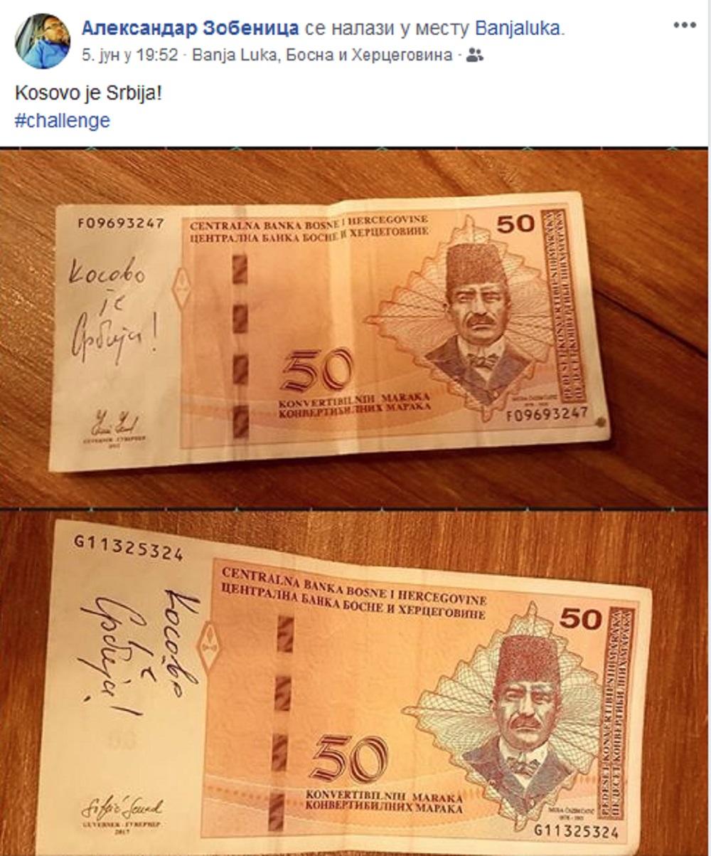 Kosovo je Srbija čelenč stigao je i do bosne odakle se javlja Aleksandar Zobenica koji je na svom Fejsbuk profilu postavio fotografiju na kojoj se vidi kako je na novčanici od 50 maraka napisao magične reči.