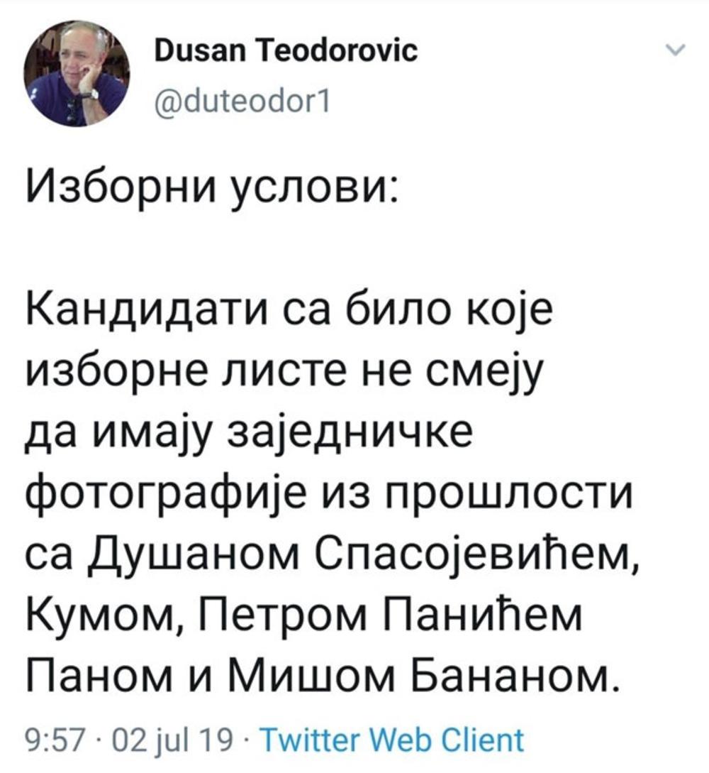 - Izborni uslovi: Kandidati sa bilo koje izborne liste ne smeju da imaju zajedničke fotografije iz prošlosti sa Dušanom Spasojevićem, Kumom, Petrom Panićem Panom i Mišom Bananom - napisao je na Tviteru Teodorović.