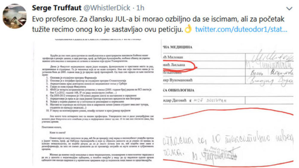 Na opasku akademika Dušana Teodorovića reagovao je Sergej Trifunović pitanjem: "A, jel' može da se kandiduje neko kome je supruga bila članica JUL-a i potpisnik podrške zloglasnom rektoru Arsenijeviću u Kragujevcu?" Na odgovore koji slede u tvirovima, gde se pita da li vezano za izborna pravila važi i fotografisanje sa Legijom, gde se aludira na Trifonovićeva poznanstva, Trfifunović je kratko odgovorio: