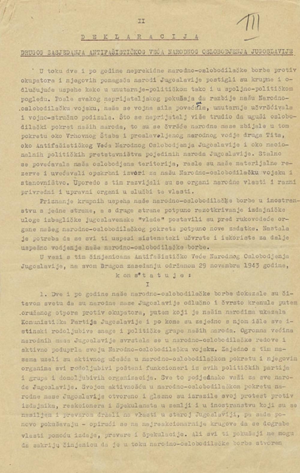 * da su skršeni ostaci velikosrpske hegemonističke politike i stvoreni materijalni, politički i moralni uslovi za buduću bratsku, demokratsku, federativnu zajednicu jugoslovenskih naroda, koji traže od saveznika da priznaju njihovu borbu protiv okupatora i slobodnu demokratsku volju