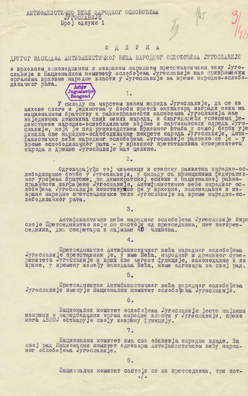 * Odluku o vrhovnom zakonodavnom i izvršnom narodnom predstavničkom telu Jugoslavije i Nacionalnom komitetu oslobođenja Jugoslavije kao privremenim organima vrhovne narodne vlasti u Jugoslaviji za vreme narodnooslobodilačkog rata