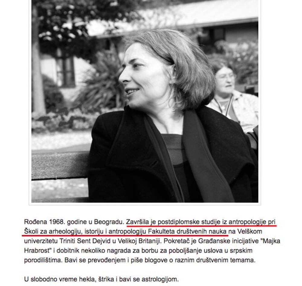 Na sajtu DJB je potom navedeno kako je stekla zvanje diplomiranog kulturologa na Velškom univerzitetu u Velikoj Britaniji.