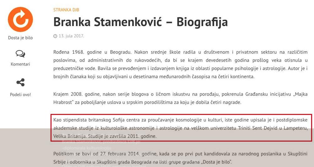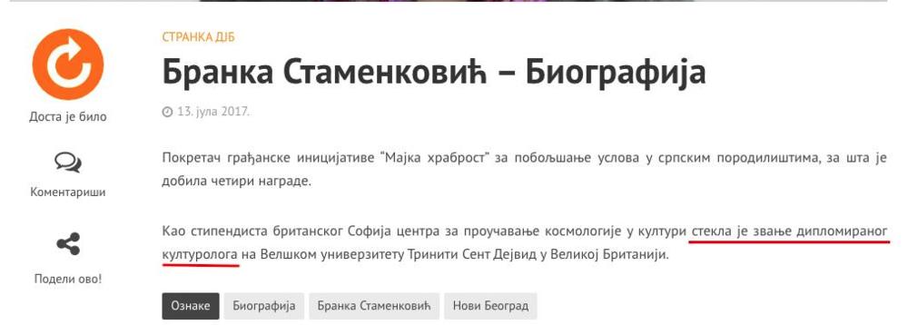Velika bura u javnosti podigla se oko obrazovanja Branke Stamenković, članice Glavnog odbora stranke "Dosta je bilo".