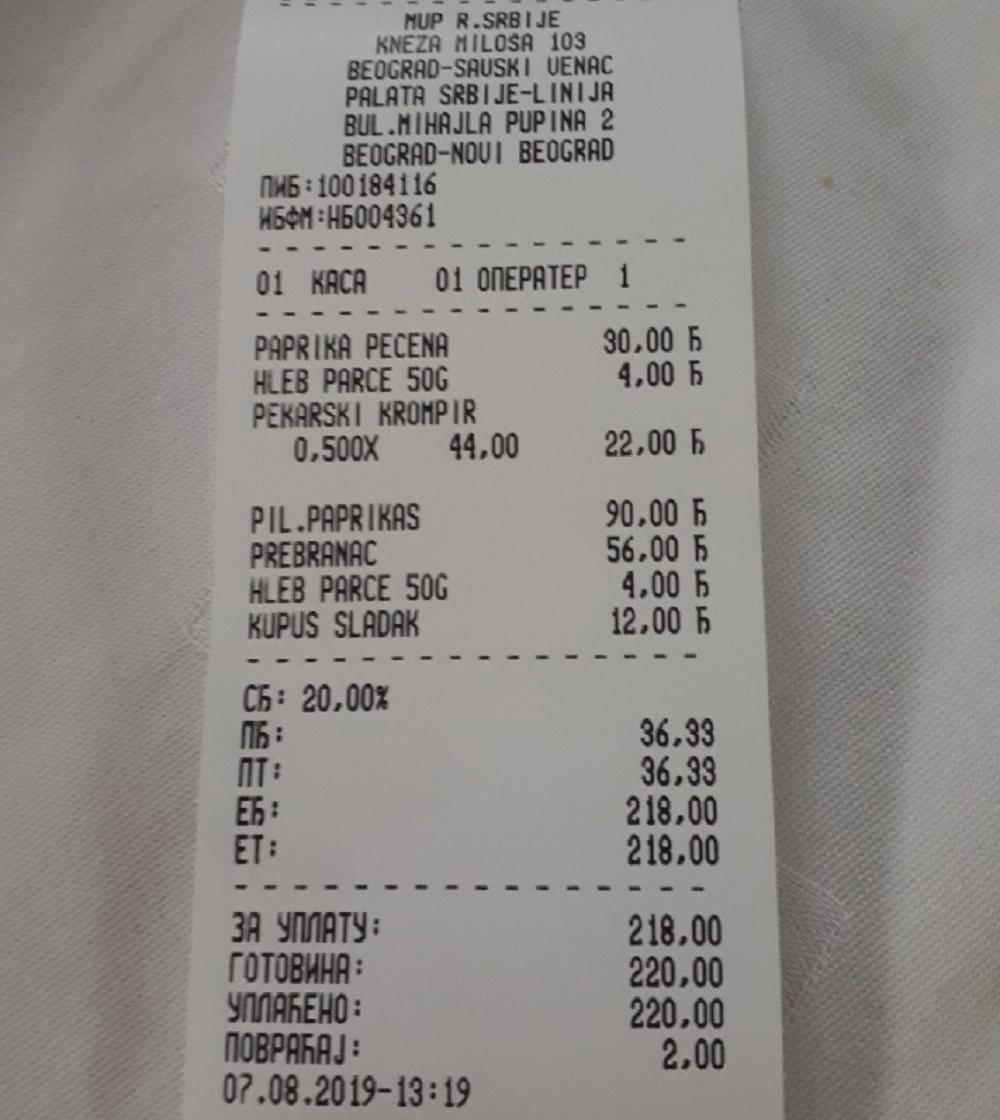 218. dinara je cifra koju bi platili u prodavnici da kupite samo hleb, mleko i 100 grama šunke, a u ovoj funkcionerskoj kafani možete jesti prebranac, pečenu papriku, kupus salatu, pekarski krompir, pileći paprikaš i dva parčeta hleba.