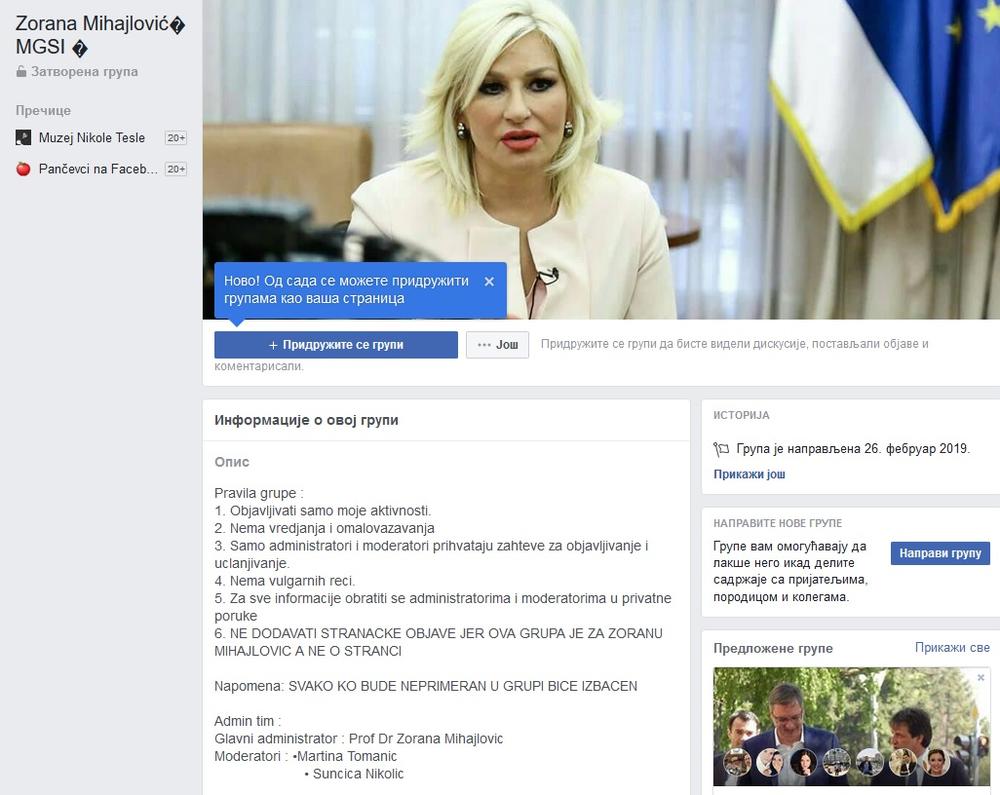 U lažnoj grupi na Fejsbuku u opisu stranice "Zorana Mihajlovic MGSI", koja je napravljena 26. februara 2019. godine piše sledeće: