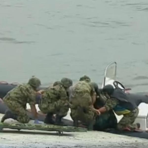 Vežbu sa vojnog broda "Kozara", posmatraju predsednik Srbije Aleksandar Vučić, ministar odbrane Aleksandar Vulin i načelnik Generalštaba Vojske Srbije Milan Mojsilović.