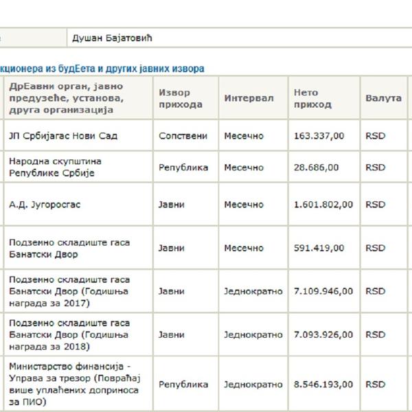 Prema zvaničnim podacima od 17.09.2019. godine, prijavljenim kod Agencije za borbu protiv korupcije Bajatović prima čak, verovali ili ne 7 plata.