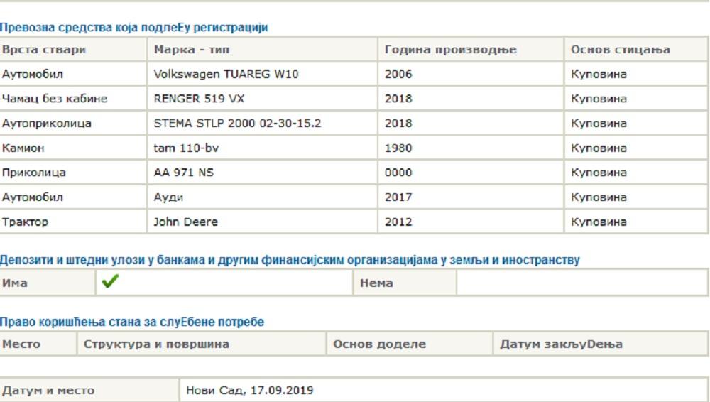 Ono što je posebno zanimljivo, jeste njegova imovina i nepokretnosti koje je prijavio, a to su stanovi, kuće, njive, vikendice, voćnjaci, vinogradi , šume, pašnjaci, zemljišta...
