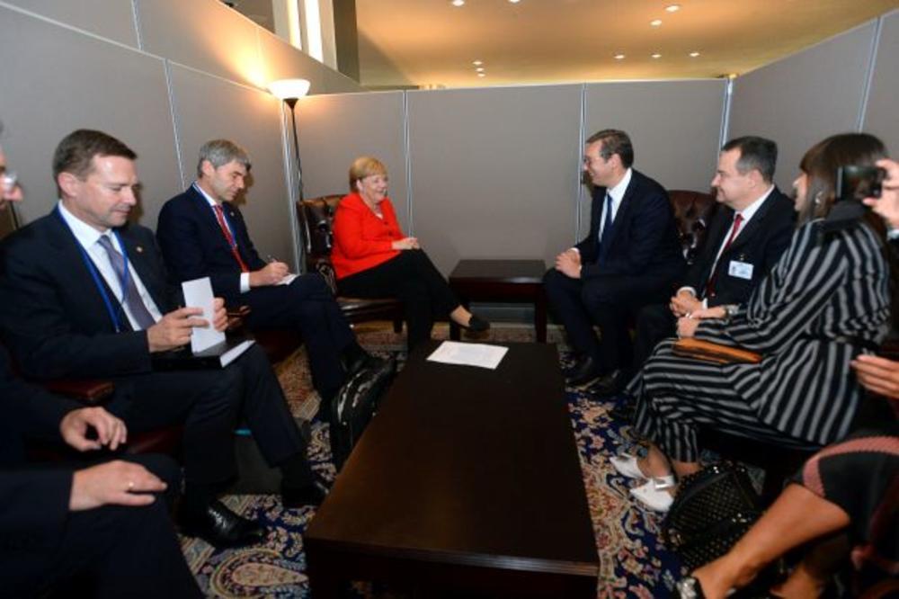 Predsednik Srbije Aleksandar Vučić sastao se danas u Njujorku sa nemačkom kancelarkom Angelom Merkel, koja je u svojoj gustoj agendi, za dan i po boravka u Njujorku, inicirala susret sa srpskim predsednikom, sa kojim će, uglavnom, razgovarati o Kosovu i Metohiji.