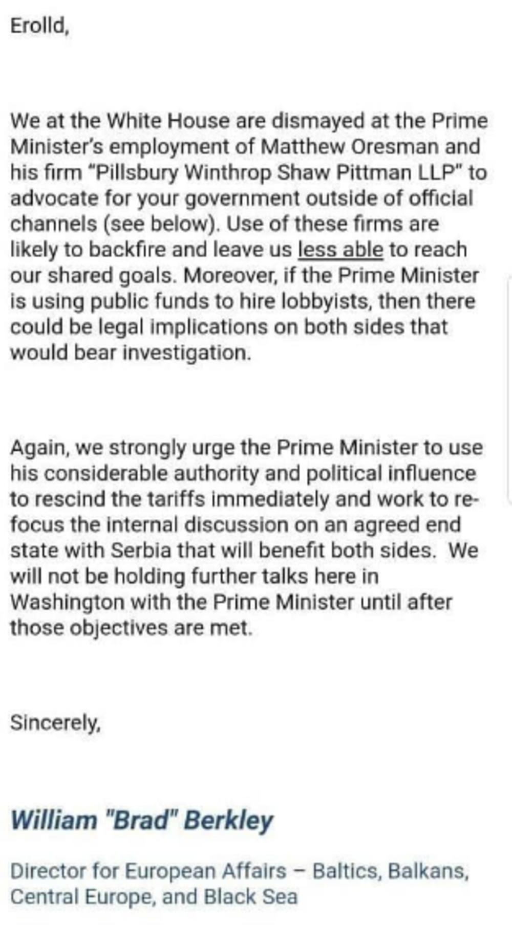 Dalje, mi snažno ohrabrujemo premijera da iskoristi svoj nesumnjivi autoritet i politički uticaj da odmah ukine takse i da se ponovo fokusira na unutrašnje konsultacije pre postizanja konačnog dogovora sa Srbijom, koji će biti postignut na korist obe strane. Nećemo održavati dalje razgovore sa premijerom ovde u Vašingtonu sve dok ovi ciljevi ne budu postignuti", napisao je Berkli.