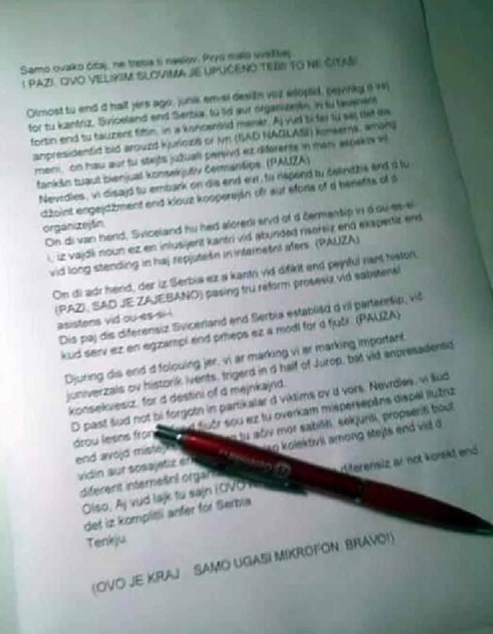 Pobednik u lošem čitanju, na lošem engleskom, sa papira je šef srpske diplomatije Ivica Dačić. On se vodi izmenjenom Vukovom - "Napišite mi kako da govorim, čitaću kako mi je napisano". Njemu je engleski napisan na čistom srpskom, sa sve pauzama i na kraju pohvalom kako je čitao. A to je uradio loše.